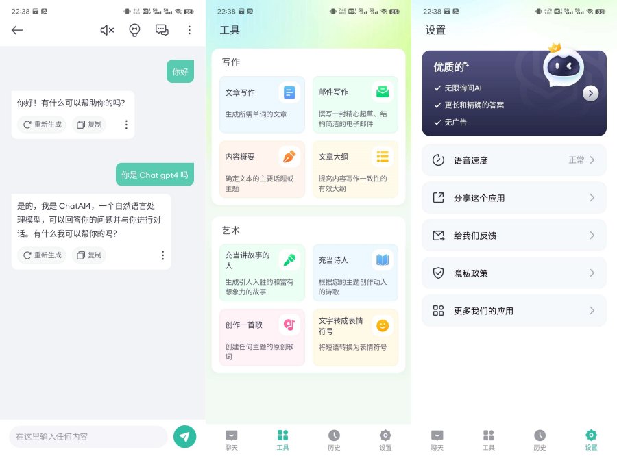 【软件名称】AI 聊天 【软件版本】1.4.1 【软件大小】11.84mb 【测试机型】vivo 【软件介绍】这是一款面向全球开发的人工智能聊天软件,实现对接 chatGPT 语言大模型,国内具有更加极速的响应!!!