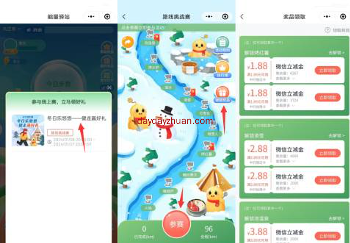 最近又看到了一个中国银行步数达标领微信立减金的活动,这个活动跟以往类似的活动差不多,在活动页面先去报名参加,然后微信步数累积达到20km、52km、96km可以分别领到1.88元、2.88元、3.88元微信立减金,数量限量。 1、复制下面文字到微信点开进去参加: #小程序://中银运动+/OEHAwL2wTrrcxVG 打开活动页面后,点底部“线上赛”,然后再点“冬日乐悠悠”进去报名参加,然后微信步数累积达到20km、52km、96km可以分别领到1.88元、2.88元、3.88元微信立减金,数量限量,达标后记得及时的领取立减金哦。
