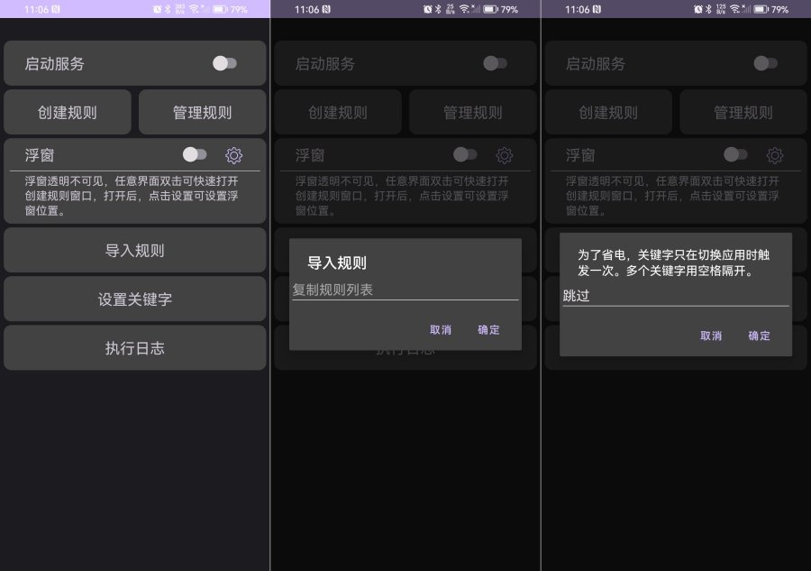 使用简单,又有一定的可定制性;大部分可通过关键字跳过,关键字不生效的可以通过APP点击添加规则
