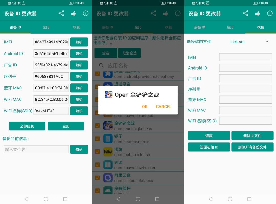 安卓修改手机ID软件是一款专门为Android手机用户设计的定制ID修改软件,可以修改您的设备信息,有效防止设备信息被其他应用程序捕获,保护手机的安全和隐私 【资源版本】:1.5.3 【资源大小】:3.95MB 【测试机型】:小米 【软件功能】: 1、修改IMEIAndroid ID序列号WiFi MAC地址当前WiFi的SSID等 2、修改设备android_ID的值,可以随机设置或手动设置。 2、支持定制模型快速修改在线模型,也可以备份模型恢复模型。 3、支持手机序列号修改和蓝牙MAC字符串号修改。 软件优势 1、支持手机型号和品牌厂商的修改。 2、支持备份和恢复,且在线型号超过N种。 3、支持软件型号、软件序列号修改。 4、可以直接、快速地修改信息,非常简单、方便。 【软件特色】: 1、Xpoesd框架模块用于android手机ID修改未经许可。 2、可以快速定制手机型号。 3、有N多种在线模型可以直接快速修改,非常简单方便。 4、界面清新,操作简单,完全公益做广告。 【软件用法】: 1、安卓修改手机ID软件是一种随机修改软件ID的工具。ROOT要修改的软件必须是未打开的,用于获取掺杂软件的新ID。 2、修改android手机的硬件信息,包括型号、CPU等信息。 3、IP地址变更方式,打开飞行模式1分钟,然后关闭IP,如果是wifi,则更改IP,重启wifi或转到wifi管理页面重新拨号。软件截图