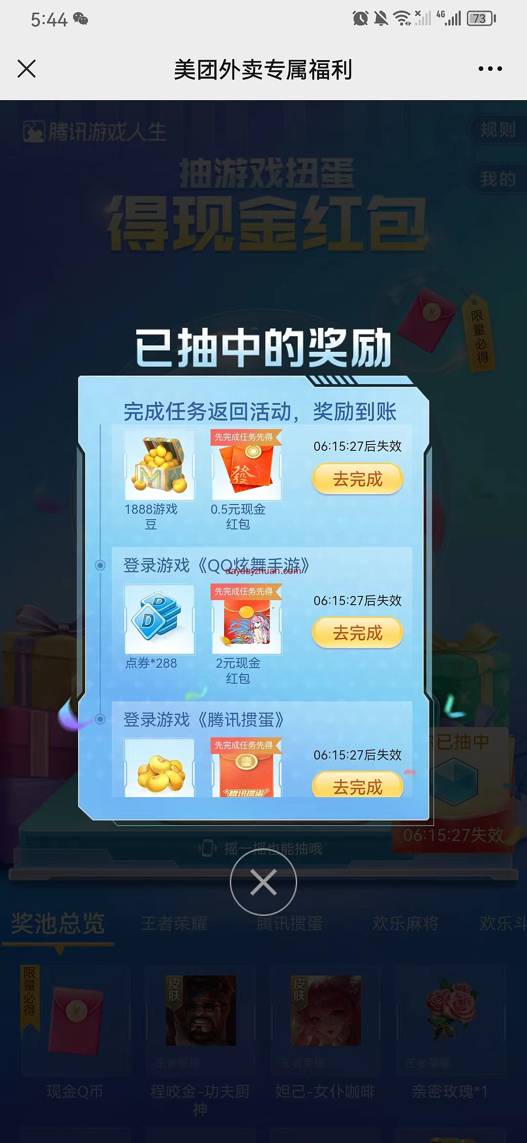腾讯游戏人生举办的美团外卖专属福利摇一摇抽现金红包活动,每天可以抽5次,奖品是随机现金红包和游戏礼包,亲测中到2+2+0.5元,先抽奖,抽到红包后再去下载对应游戏领取奖品,天天线报网的赚友赶紧上吧。 1、微信和QQ都可以去,中到红包再登录指定的手游,然后就可以回到活动里领取,安卓手机也可以去腾讯先锋APP搜索游戏名称秒玩登录 如果兑换失败的就晚点再去兑换试试,小编现在去兑换也提示失败