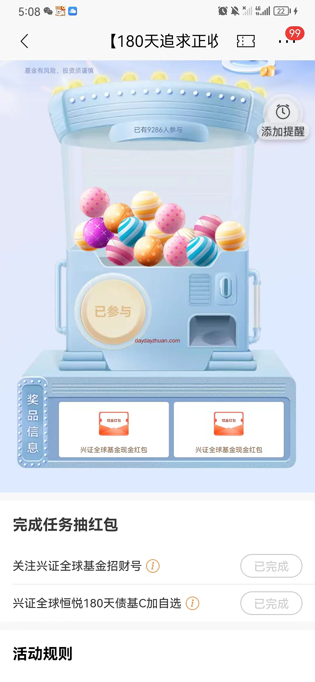 招商银行红包又来了,上次领的基金体验金红包已经到期了一共领了2元收益,有撸的赚友可以去看看,原文:https://www.daydayzhuan.com/article/18619,这次比较简单,简单加2个基金自选就能领一个红包,亲测0.2元,可以直接提现,天天线报网的赚友赶紧上吧。 1、复制链接到微信打开,然后跳转到招行app参与活动。 2、关注+自选,完成任务后直接去抽红包,奖品也只有红包。 3、红包需要手动提现,秒到银行卡。